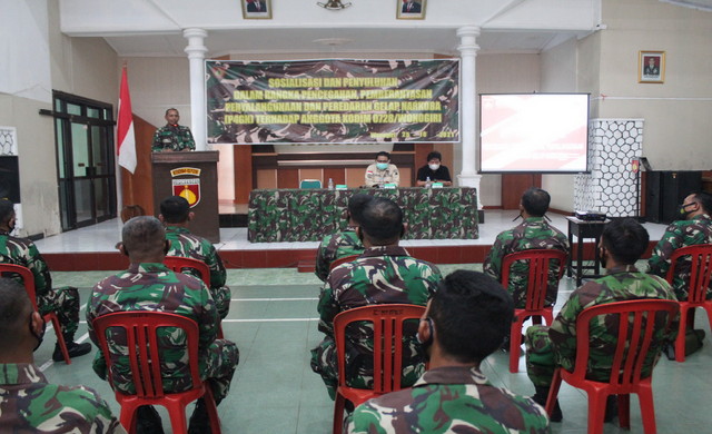 Wonogiri. – Upaya nyata untuk memerangi bahaya Narkoba terlebih bagi anggotanya, Kodim 0728/Wonogiri menggelar sosialisasi upaya Pencegahan Pemberatasan Penyalahgunaan dan Peredaran Gelap Narkoba (P4GN) yang bertempat di Makodim, Senin 25/10/2021.