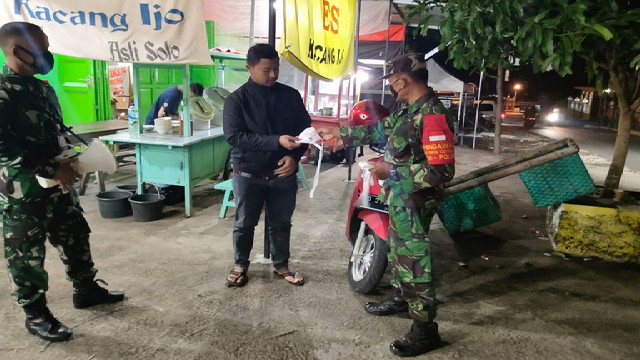 Boyolali. Dalam rangka memutus mata rantai penyebaran Virus Corona(Covid-19). Babinsa Koramil 05 Ampel Kodim 0724/Boyolali Sertu Sakur dan Babinsa lainnya melaksanakan patroli dan memberikan masker gratis pada warga serta himbauan tentang pencegahan virus corona dengan cara memberikan protokol kesehatan 5 M, Jumat Malam 12/11/2021.