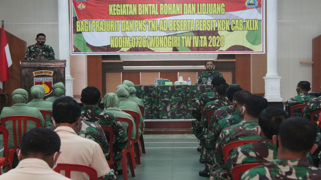 Tampabatas.com(SMSI), Wonogiri.- Guna meningkatkan Mental Rohani, Ideologi dan Kejuangan Prajurit dan PNS TNI beserta keluarga, Kodim 0728/Wonogiri menggelar Bimbingan Rohani(Binroh) dan Pembinaan Mental Ideologi Kejuangan (Bintalidjuang), Senin 09/11/2020.