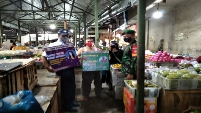 Surakarta.- Piket Koramil 03 Serengan Kodim 0735 Surakarta Serka M.Nur Hakib didampingi Satpam Pasar melaksanakan Pemberlakuan Pembatasan Kegiatan Masyarakat ( PPKM ) bertempat di Pasar Horjodaksino Jl. Yos Sudarso Danukusuman Serengan Kota Surakarta, Sabtu 03/04/2021.