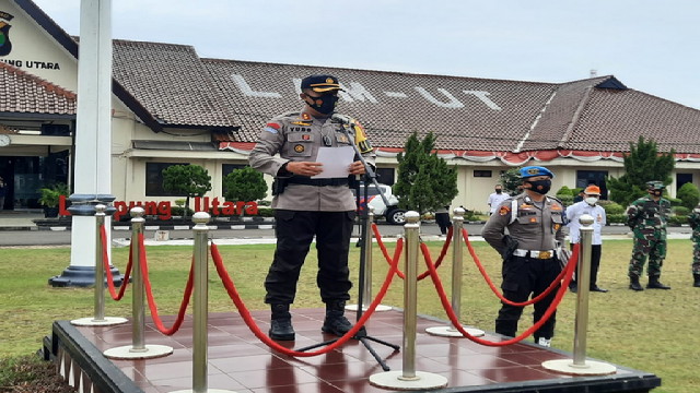 Peserta apel dari Personil Polres Lampung Utara, TNI, Sat Pol PP dan Dinas Kesehatan Kab. Lampung Utara.Turut hadir pada kegiatan tersebut Forkopimda Kabupaten Lampung Utara, beberapa para Kepala Dinas instansi, pejabat utama Polres dan Kapolsek.