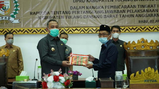 Rapat Paripurna DPRD Kabupaten Tulangbawang Barat dalam rangka Pembicaraan Tingkat I atas Raperda tentang Pertanggung Jawaban Pelaksanaan APBD Kabupaten Tulangbawang Barat TA 2020, di Ruang Paripurna DPRD setempat. Rabu 02/06/2021.