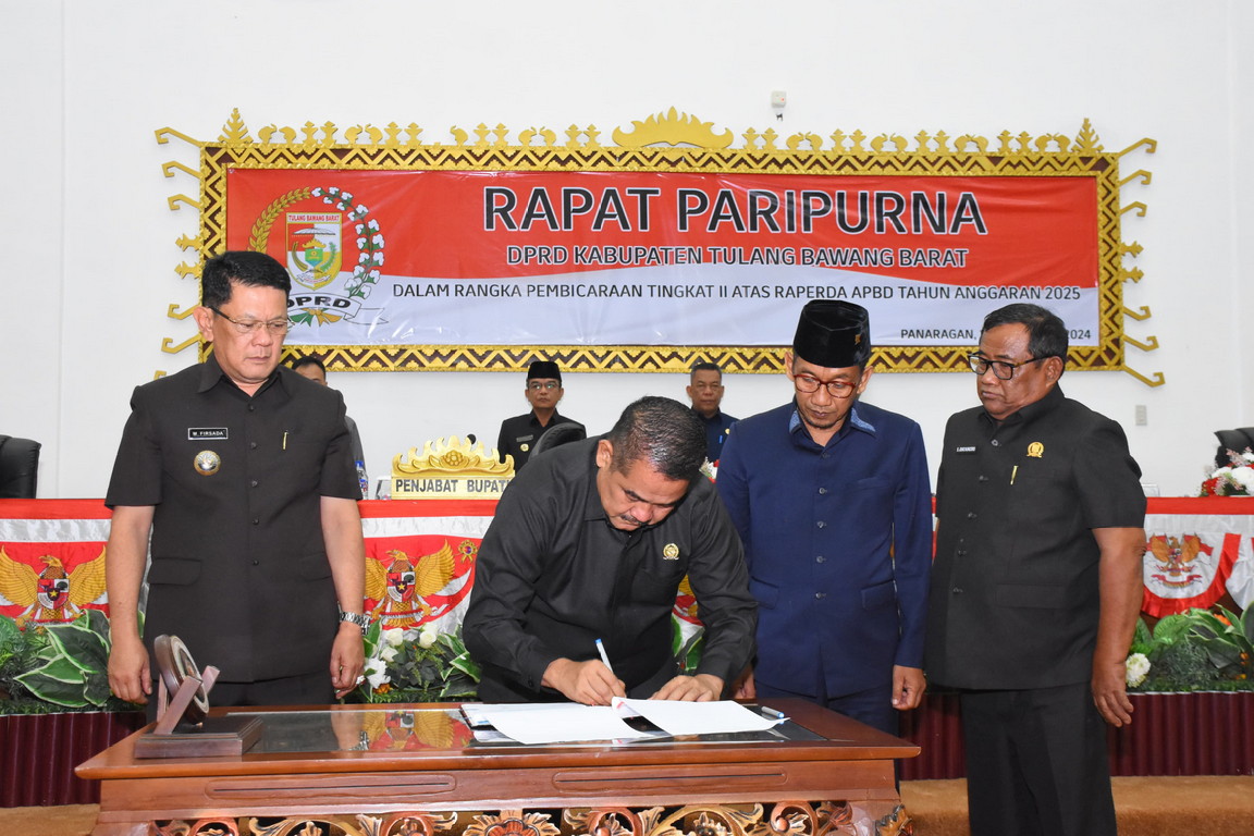 Rancangan Peraturan Daerah (Raperda) Anggaran Pendapatan dan Belanja Daerah (APBD) Kabupaten Tulang Bawang Barat (Tubaba) Tahun Anggaran (TA) 2025 disahkan pada Rapat Paripurna DPRD Kabupaten Tubaba, dengan agenda Pembicaraan Tingkat II Atas Raperda tentang APBD Kabupaten Tubaba TA 2025. Di Ruang Paripurna DPRD setempat. Jumat (29/11/2024) yang lalu.