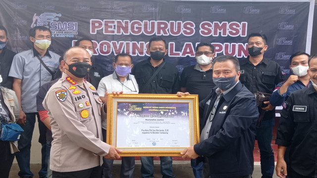 Penghargaan Restorative Justice ini diberikan atas penyelesaian perkara pidana pencurian besi sepanjang tiga meter, dengan rasa keadilan dan kemanusian di wilayah hukum Polresta Bandar Lampung. Penghargaan diberikan langsung oleh Ketua SMSI Provinsi Lampung Donny Irawan, SE, didampingi Sekretaris SMSI H. Senen, S.I.Kom.