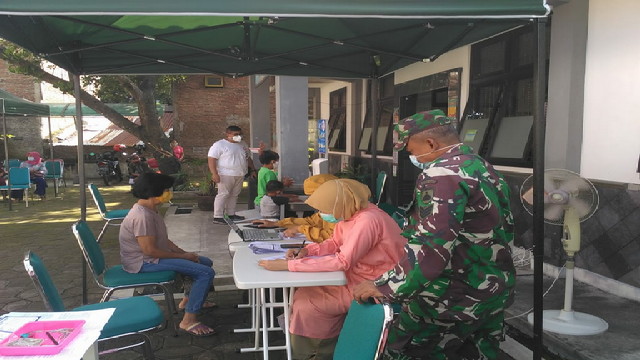 Surakarta.- Bertempat di Puskesmas Pembantu Makam Cilik Jl. Jamsaren No. 41A Dawung Kulon Rt 02 Rw 10 Serengan Kota Surakarta, Babinsa Kelurahan Serengan Koramil 03 Serengan Kodim 0735 Surakarta Serka Aris S memantau dan Hadiri kegiatan pelaksanaan Suntik Vaksin Sinovac oleh Tim Vaksin Dr Restu Buddari (Pelaksana Vaksin), sebagai penanggung jawab kegiatan dr. Anjang Kusuma ( Kepala Puskesmas Jayengan), Senin 12/04/2021.