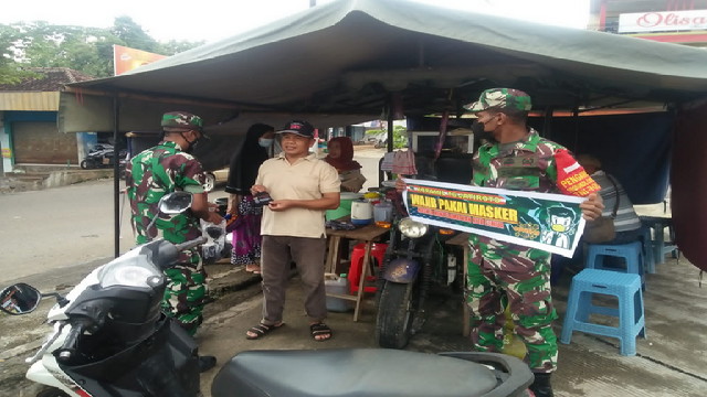 Surakarta – Serka Sugiyanto Babinsa Kelurahan Kauman anggota Koramil 05/ Pasarkliwon , Kodim 0735/Surakarta bersama Satpam Pasar Cinderamata melakukan upaya dalam mencegah penyebaran Covid 19 di wilayah binaannya dengan memberikan himbauan protokol kesehatan dan membagikan masker pada warga masyarakat yang ada di Wilayahnya, Selasa 17/08/2021.