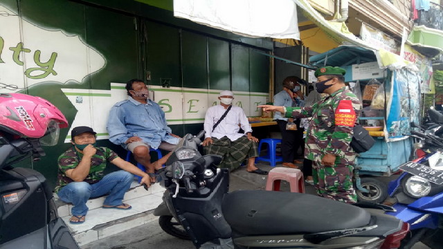 Surakarta.- Babinsa Kelurahan Kauman Serka Sugiyanto anggota Koramil 05 Pasar Kliwon , Kodim 0735 Surakarta , Aktif menyampaikan kepada para pengunjung pasar Cinderamata serta masyarakat sendiri bahwa suatu keharusan bagi kita untuk senantiasa menghimbau dan mengajak semua warga untuk terus disiplin terhadap Protokol Kesehatan,pencegahan Covid-19 karena sampai saat ini penyebarannya semakin meluas. Minggu 31/01/2021.