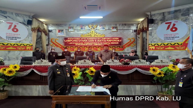 DPRD Kabupaten Lampung Utara menggelar Sidang Paripurna tahap akhir dari seluruh rangkaian pembahasan atas 4 (empat) RAPERDA, yaitu 3 (tiga) RAPERDA Inisiatif DPRD Kabupaten Lampung Utara, serta 1 (satu) RAPERDA yang berasal dari Pemerintah Kabupaten Lampung Utara.