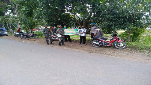 Wonogiri.- Dalam upaya memutus penyebaran Covod-19, Anggota Koramil 24/Puhpelem Sertu Agus dan Serda Mulyawan bersama dengan anggota Polsek Puhpelem Bripka Agus dan Bripka Hanan melaksanakan patroli penegakan disiplin protkes, Rabu 14/04/2021.