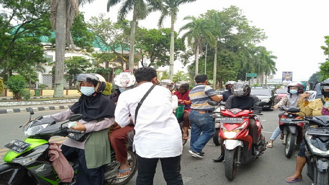 METRO – Pengurus dan anggota Serikat Media Siber Indonesia (SMSI) Kota Metro membagikan ratusan takjil dan masker di seputaran Bumi Sai Wawai Kota Metro.
