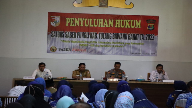 Tulang Bawang Barat (Tubaba).- Polres Tulangbawang Barat Polda Lampung mengadakan kegiatan sosialisasi Saber Pungli (Sapu Bersih Pungutan Liar) di Aula Wisma Asri Tiyuh Tirta Makmur Kec Tulangbawang Tengah Kab Tulangbawang Barat, Senin siang 05/09/2022.