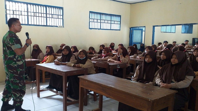 Wonogiri – Babinsa Koramil 12/Eromoko Sertu Wahyudi memberikan materi Wawasan Kebangsaan (Wasbang) kepada Siswa-siswi SMP Muhamadiyah 7 Eromoko, Sabtu (11/6/22) kemarin.