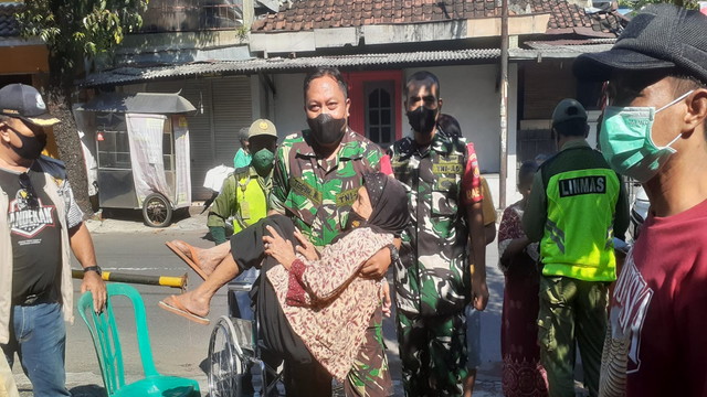 Mengetahui salah satu penerima bantuan yang sudah Lansia dan kesulitan berjalan, Babinsa Kelurahan Gandekan Koramil 04/Jebres Kodim 0735/Surakarta, Serda Teguh K dan Serda Joko Riyadi secara spontan dan gerak cepat (Gercep) membantu dengan membopongnya, menuju ke Pendopo Citra Duta untuk menerima haknya.