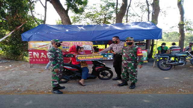 Wonogiri. – Guna memutus penyebaran Covid-19 diwilayah teritorialnya, anggota Koramil 24/Puhpelem Serda Winarto bersama dengan anggota Polsek Puhpelem Bribka Agus, aktif melaksanakan patrol penegakan disiplin protocol kesehatan, Senin 06/09/2021.