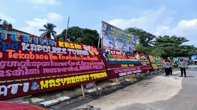 Tampak terlihat karangan bungan tersebut terpampang di pinggir halaman Mapolres Tubaba.