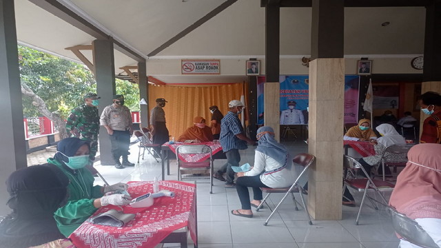 Batuud Koramil 06/Batuwarno Peltu Dedy Kurniawan, mewakili Danramil Kapten Inf Budi Raharjo bersama jajaran Forkopincam Batuwarno memantau secara langsung pelaksanaan vaksinasi yang digelar di Pendopo Kecamatan, Rabu 22/09/2021.