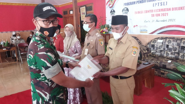Di Kecamatan Bulukerto, anggota Koramil 21/Bukukerto Serma Suparno mewakili Danramil Kapten Arm Agus Setiyono menghadiri kegiatan Penyerahan Sertifikat Massal Hak Atas Tanah, Pendaftaran Tanah Sistematis Lengkap (PTSL) oleh Wakil Bupati Wonogiri. Kegiatan berlangsung di Balai Desa Conto, Rabu 01/12/2021.